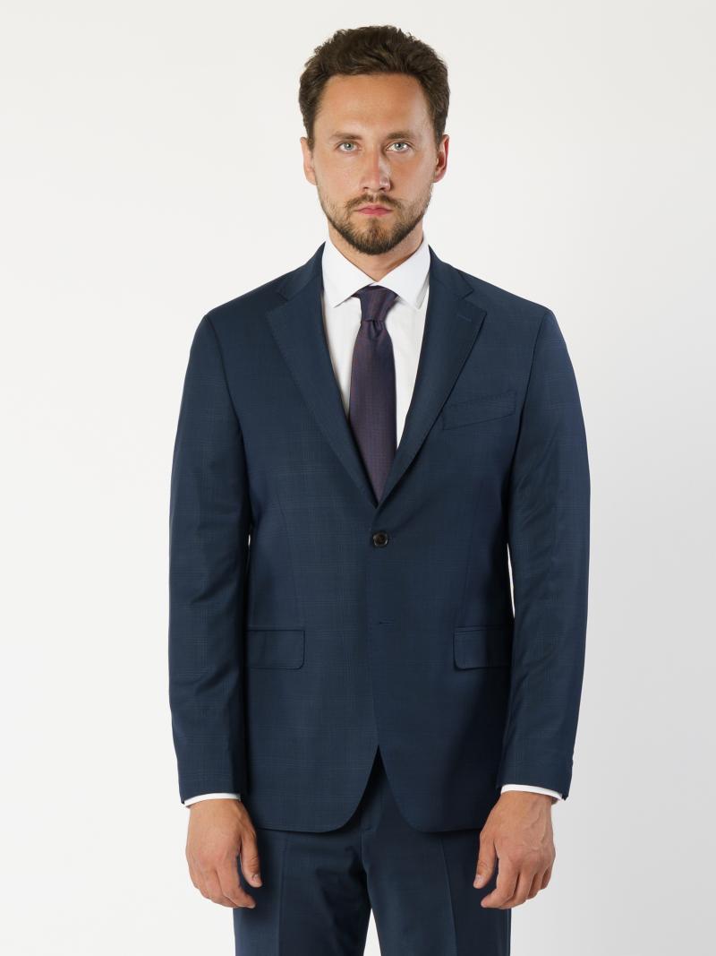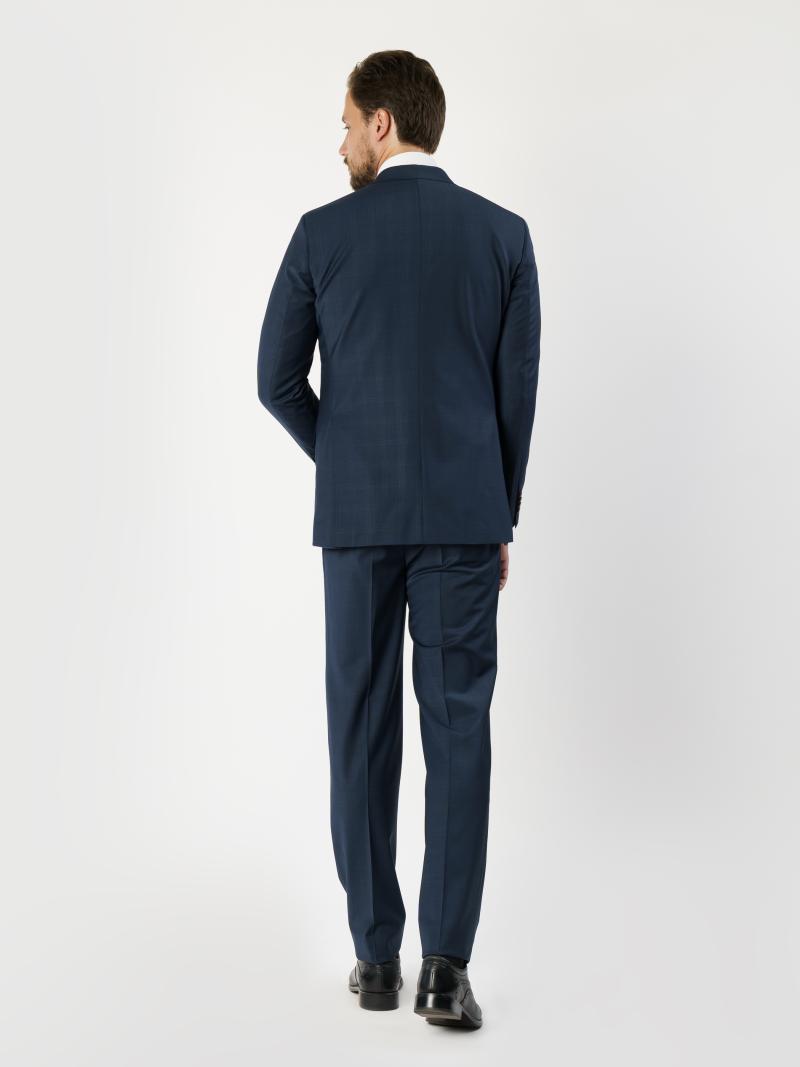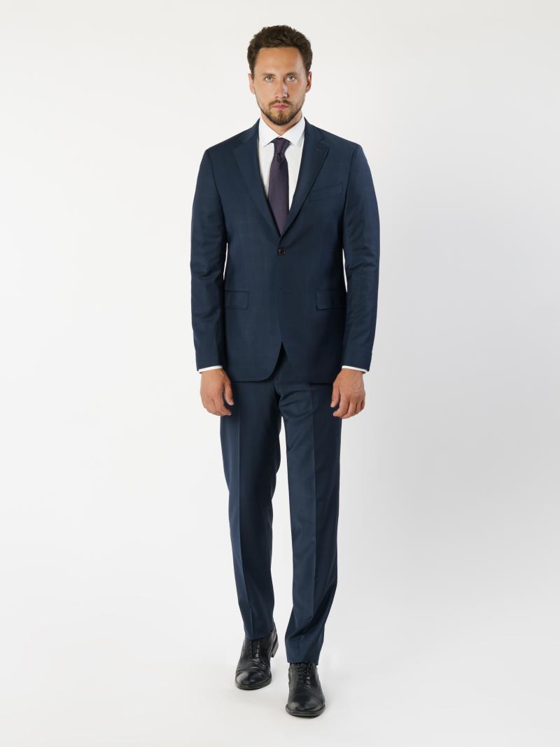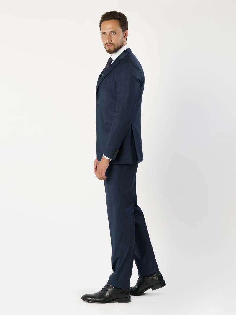 Изысканный мужской костюм Arber Selection, темно-синего цвета, созданный из натуральной качественной шерсти с эластаном. Модель пиджака имеет приталенный крой с прямым лацканом, однобортный на 2 пуговицы, с двумя карманами с клапаном и двумя шлицами. Брюки средней посадки, зауженные к низу, со стрелками, двумя наклоненными карманами по бокам и двумя задними прорезными, с застежкой на молнию и пуговицу. В этом костюме утром можно создать формальный образ, а вечером, сняв галстук, можно отправиться на светское мероприятие.